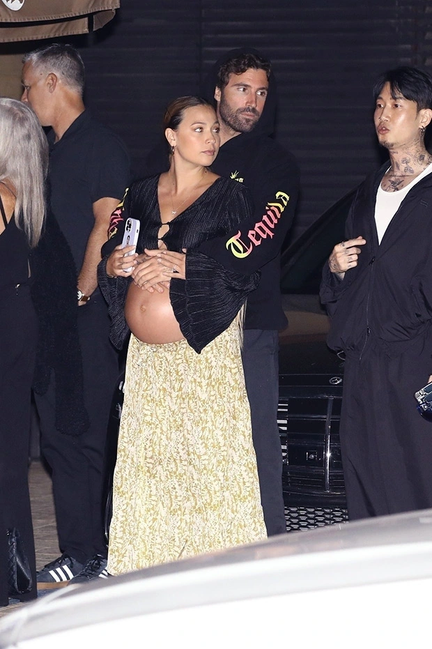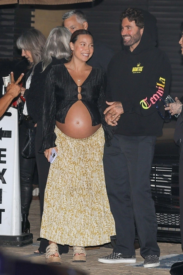Brody Jenner looked deeply in love as he cradled pregnant fiancée Tia Blanco‘s baby bump on Wednesday, June 21. In photos you can see below, the DJ, 39, wrapped his arms around his wife-to-be, 25, and cradled her as she bared her growing baby bump in a plunging black top with dramatic bell sleeves. She wore a floor-length floral yellow and white skirt, and pulled her light brown hair back, accessorizing with simple gold hoops. She finished the look with chunky platform sandals.