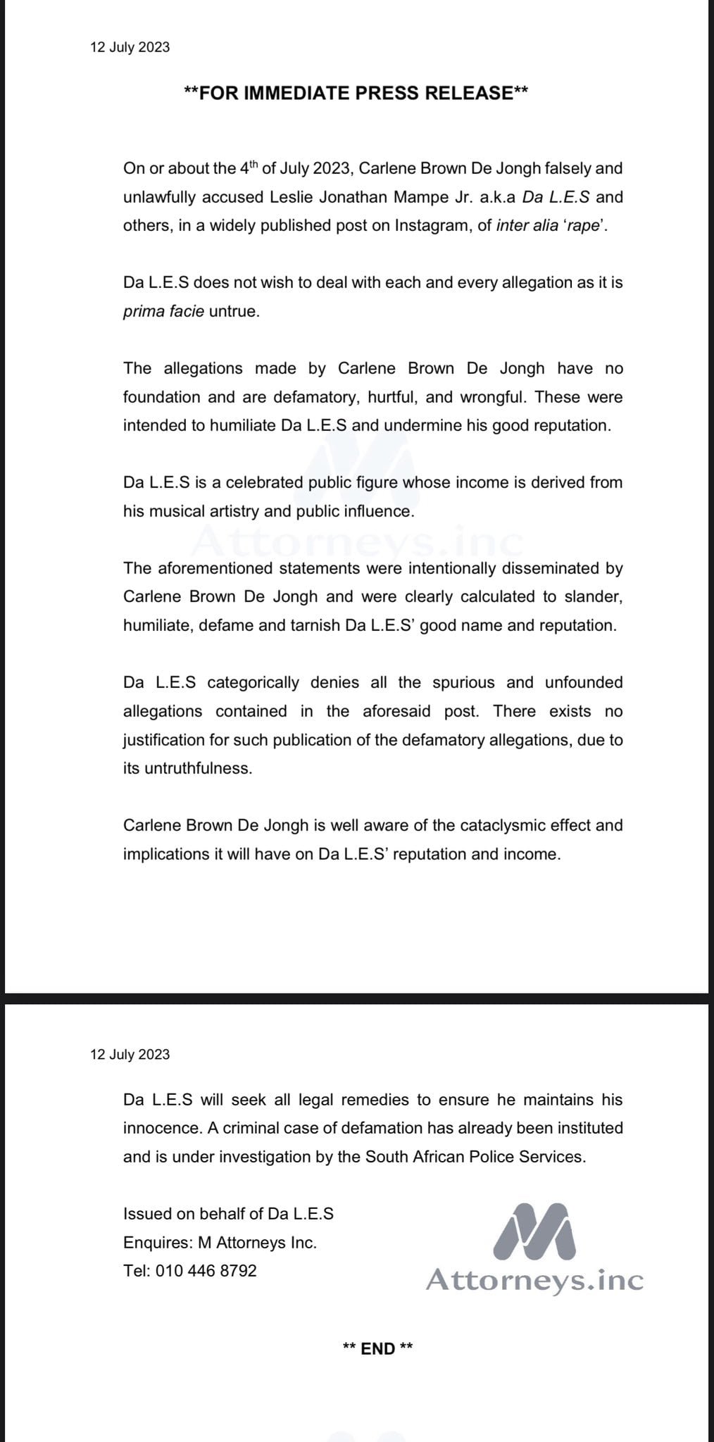 The allegation made by Carlene Brown De Jongh have no foundation and are defamatory, hurtful, and wrongful. These were intended to humiliate Da L.E.S and undermine his good reputation.”