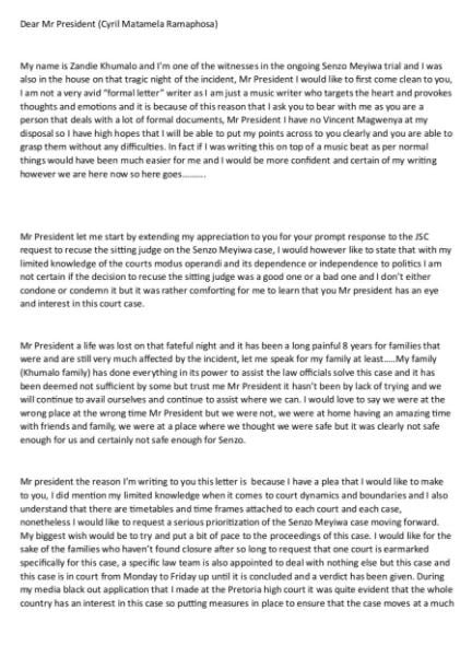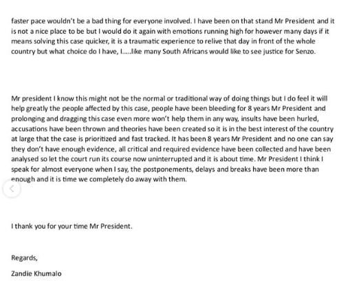The essence of the letter is to plead with the President in ensuring that the murder case is prioritized and fast-tracked so that Senzo’s family can get closure and other people can be relieved.